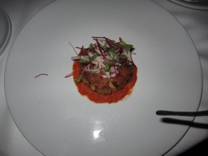 Amuse-Bouche aka “mouth amuser” – don’t worry, my mind went there too, but in this case it was a bite-sized appetizer of tuna and creamy sauce which is meant to prepare us for the decadence ahead. Dinner can be summed up in three words – Best Risotto Ever! But before the risotto came into my life we started with a Crab Cake – blue crab cake with smoked tomato coulis and radish salad. Not usually a big seafood fan but this crab cake just melted in my mouth. Then came the risotto – the Lobster Risotto – double smoked bacon and corn risotto with butter poached lobster. For a girl who doesn’t like seafood much, I definitely ordered alot of it! There are no words to describe this meal except that it was perfect. Cooked to perfection, blended with preciseness and presented like a piece of art. Like a clandestine affair, I just couldn’t get enough. There was no room for dessert (shocking I know) since the two bottles of Valpolicella were setting in and making all future decison making rather difficult and fuzzy.