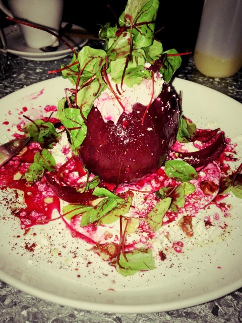 From the Chilled section we ordered the beet + goat cheese + pickled red onion + walnut + sherry dressing + yogourt
