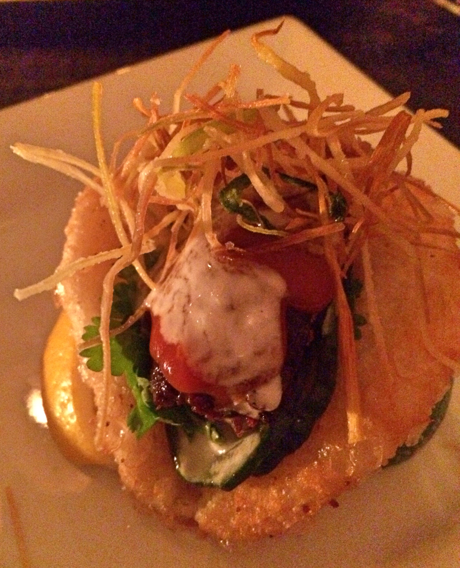 Lisa Marie is owned by Matt Basile who actually uses the resto as a production kitchen for his food truck Priscilla. I sampled some of his stuff at the first TUM event I went to and it was a definite stand out. Lisa Marie also did not disappoint. Its open concept allows for mostly family style seating on high rise tables with up to 8 people a table. We were only two so we shared a table with another group. The decor is rock inspired, dimly lit and exudes a trendy vibe with some kick ass dinner tunes. The menu is either made up of smaller share plates (1-2 servings) or larger potion share plates for larger groups.